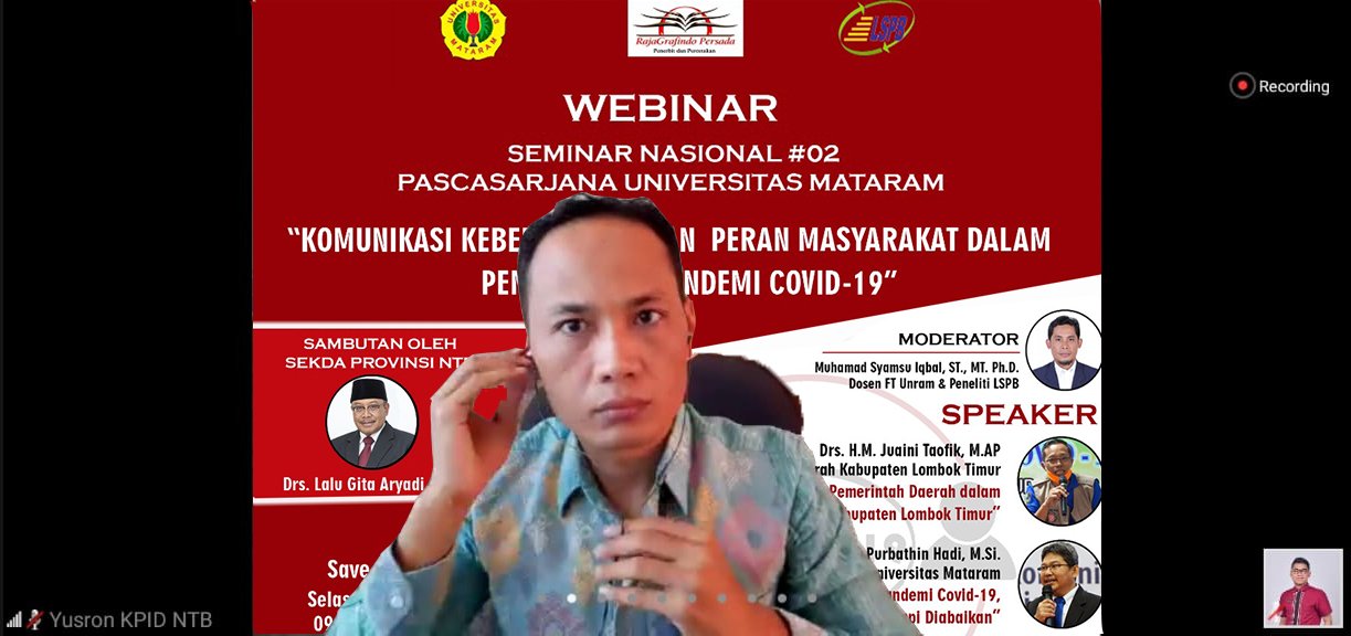Selasa, 12 Mei 2020, Seminar Nasional yang dilaksanakan via platform zoom menghadirkan beberapa pembicara dari kalangan pemerintah daerah dan akademisi. Ketua KPID NTB Yusron Saudi, ST, M.Pd menjadi salah satu pembicara pada seminar tersebut, Yusron menyampaikan terkait dengan peran pers dan lembaga penyiaran dalam penyampaian informasi dan edukasi penanganan pandemi covid-19.