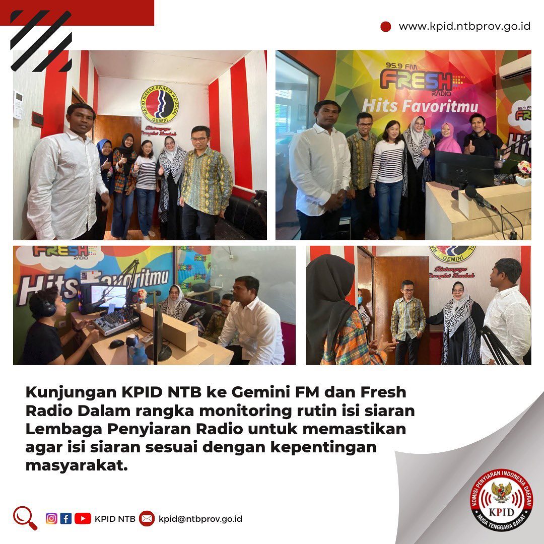 30 agustus 2022, KOMISIONER KPID NTB melakukan kunjungan monitoring aktifitas di lingkungn studio siaran radio dangdut lombok Gemini FM, dan studio siaran Fresh Radio PT. Lombok Citra Buana Swara di jalan Bung Karno no.22 Mataram.
