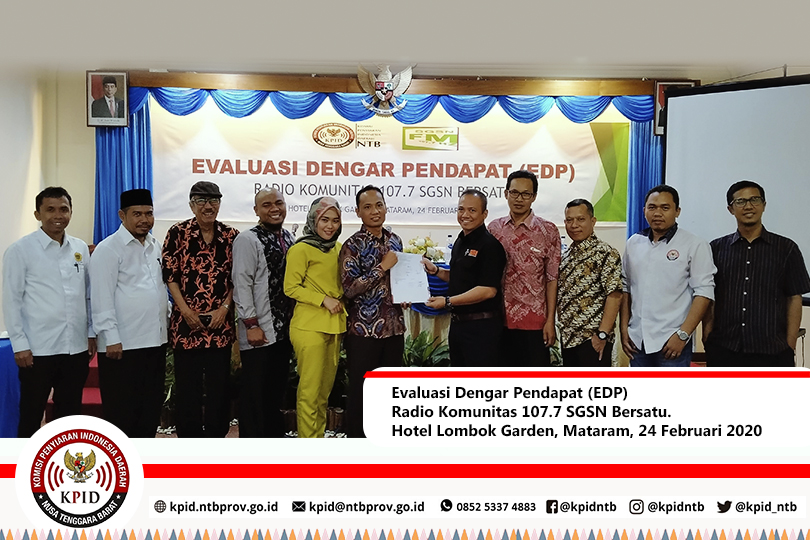 Komisi Penyiaran Indonesia Daerah (KPID) Provinis Nusa Tenggara Barat Gelar Kegiatan Evaluasi Dengar Pendapat (EDP) dengan Radio SGSN yang mengajukan perpanjangan Izin Penyelenggaraan Penyiaran (IPP), dimana kegiatan Evaluasi Dengar Pendapat ini merupakan salah satu tahapan yang dilalui oleh lembaga penyiaran ketika akan memperpanjang maupun membuat proses perijinan baru. Mataram, 24 februari 2020.
